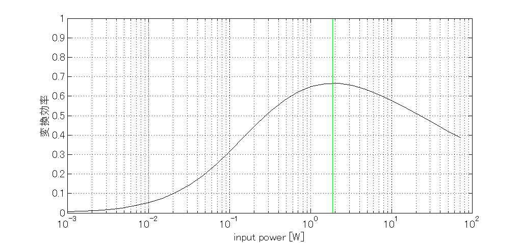 下図ではロスを考慮に入れた計算を行っている。緑の線は最大の効率となる点であり,
