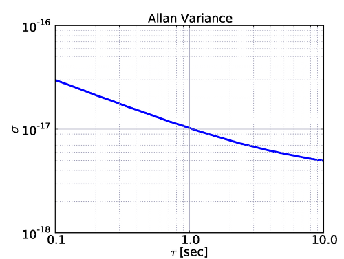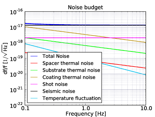 この周波数安定化システムの原理的雑音の予想スペクトルをプロットしたのが 下図左である。これらの雑音から予想されるアラン分散は右図のようになり、1秒で 10^-17が達成される。雑音スペクトルを見ると、0.1-10Hzの全帯域で振動起 因の弾性変形による共振器長変動が支配的な雑音となっている。この雑音をさ らに低減するオプションとして、LCGT向けに開発中の低温能動防振システムを 導入することが考えられる。これは、Hexapod支持された六自由度制御可能なス テージと低温動作可能な加速度計を組み合わせて地面振動をフィードバックで 打ち消すものであり、ヒートリンクを通じて伝わってくる冷凍機の振動も打ち 消すことができる。コーティング熱雑音を測定する際は、15Kまで昇温し、ビー ム径を絞ることで熱雑音レベルを地面振動雑音より大きくする。