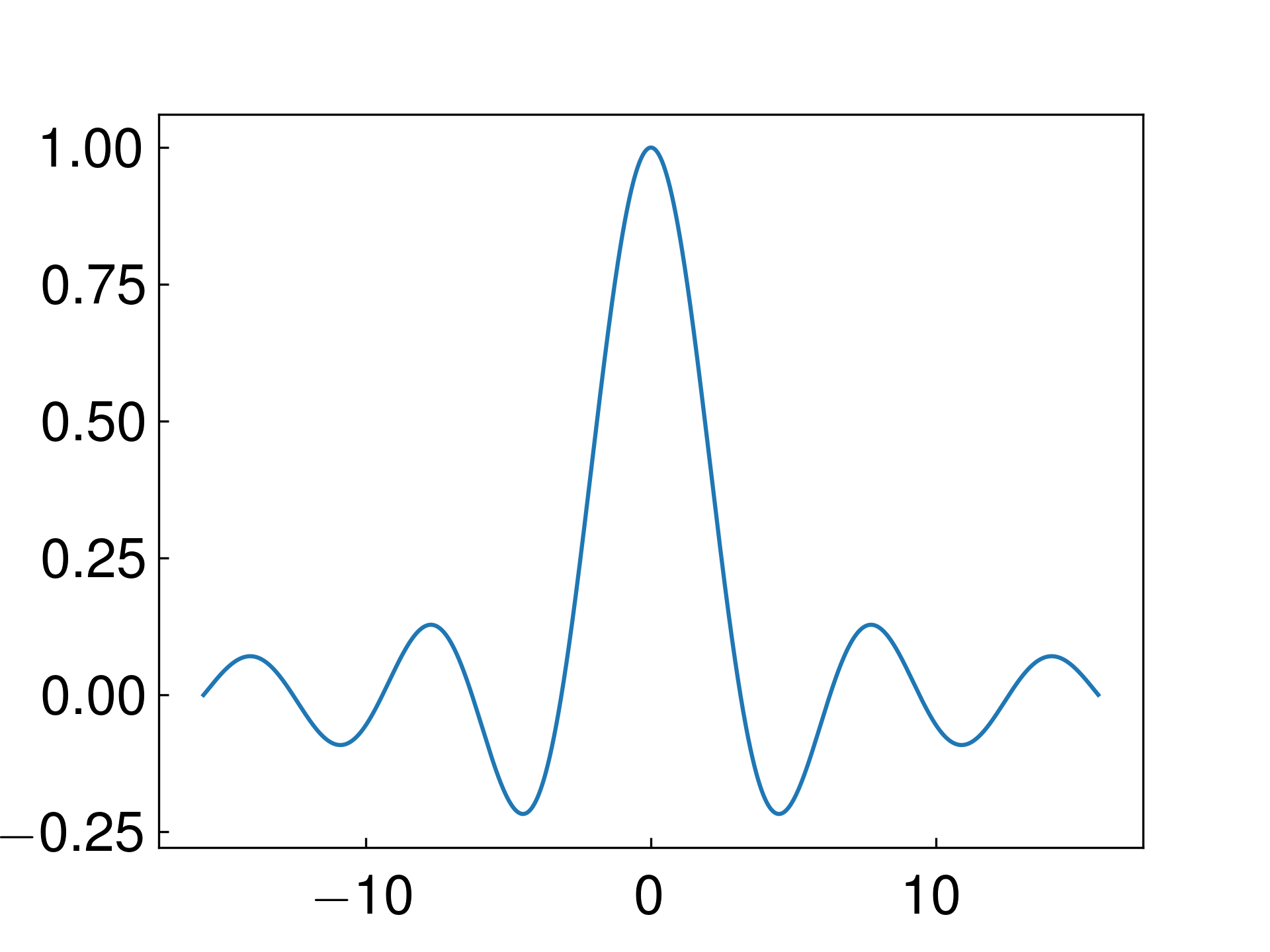 これで作られたxは,np.array というオブジェクトである. 細かいことはドキュメントを見てもらうとして,xを先ほど定義した sinc に代入すればプロットの縦軸の値が得られる.