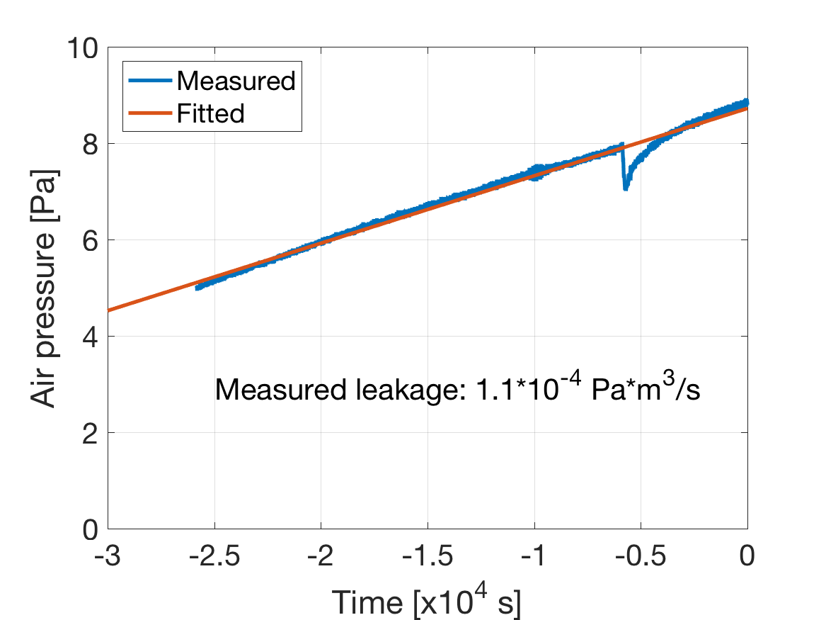 結果としては、およそ6x10^-4 Pa*m^3/sのリークが認められた。これがどういう原因かは調べていない。(どこかのフランジのリーク?壁面のガス分子の脱離?)
