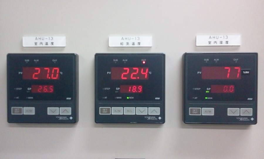 三つの制御ユニットが並んでおり、それぞれに、PV, SPという液晶表示部が存在する。 PVが何の略かは定かでないが、Present Valueかそのあたりの意味であろう。ここには室内の温度、給気温度、湿度等の現在の値が表示される。SPはSet Pointであろう。つまり制御の目標値である。